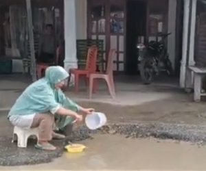Aksi cuci piring di tengah kubangan air jalan raya Pulau Tengah, Kerinci, Jambi diperagakan seorang ibu rumah tangga. Aksi itu disebut bentuk protes...